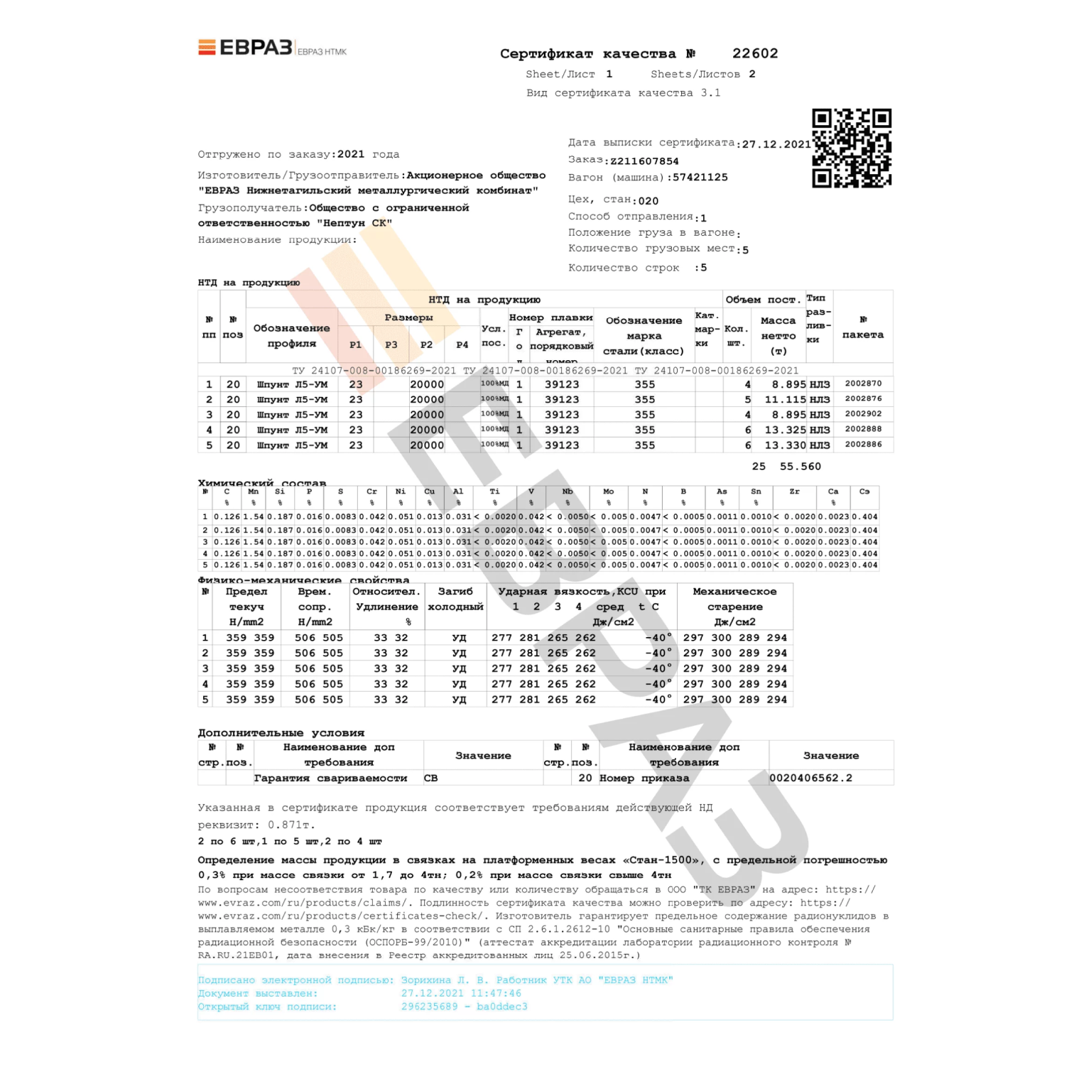 Каждая партия шпунта сопровождается уникальным сертификатом качества.